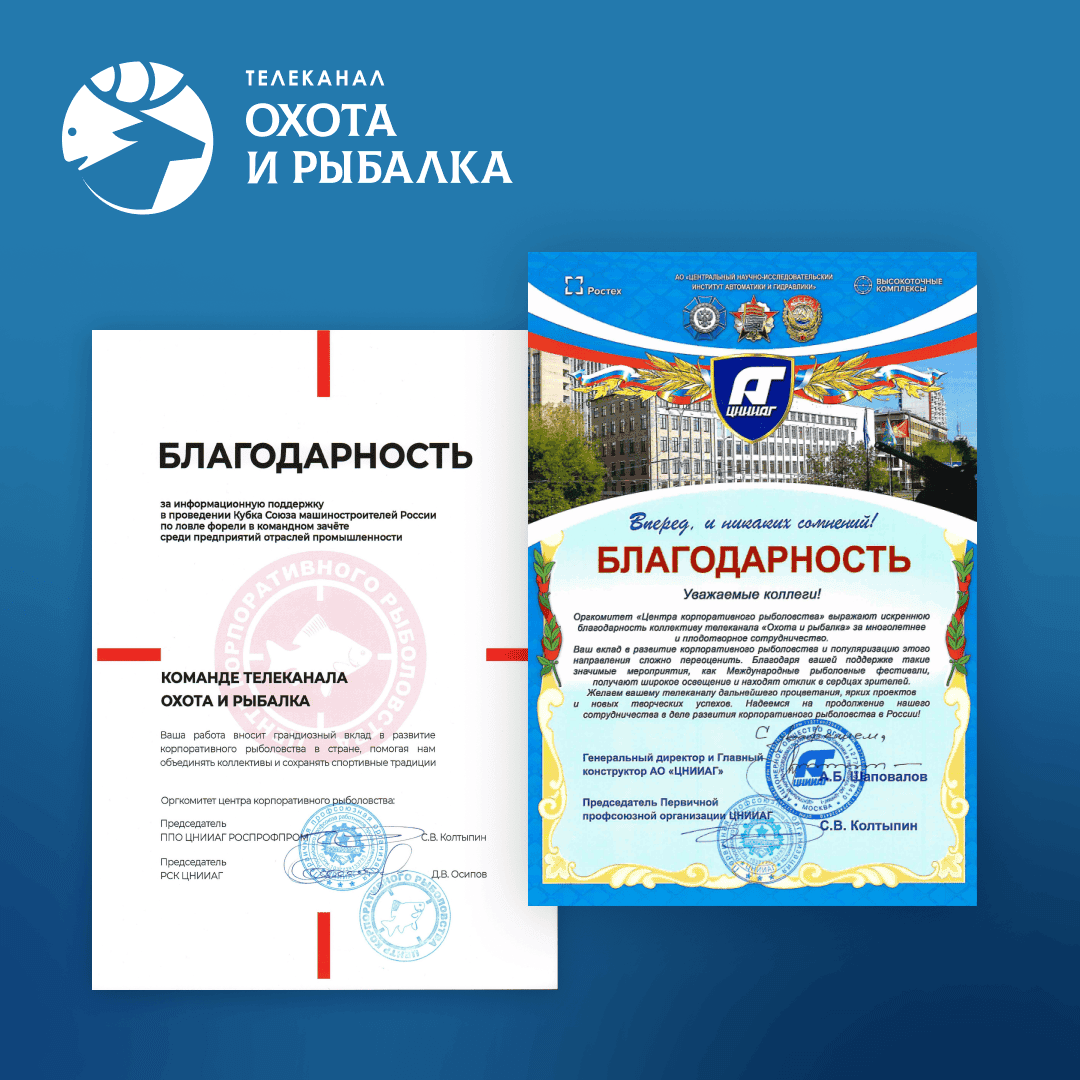 Центральный научно-исследовательский институт автоматики и гидравлики вручил каналу благодарность за многолетнее плодотворное сотрудничество и значительный вклад в популяризацию рыболовного движения в России.